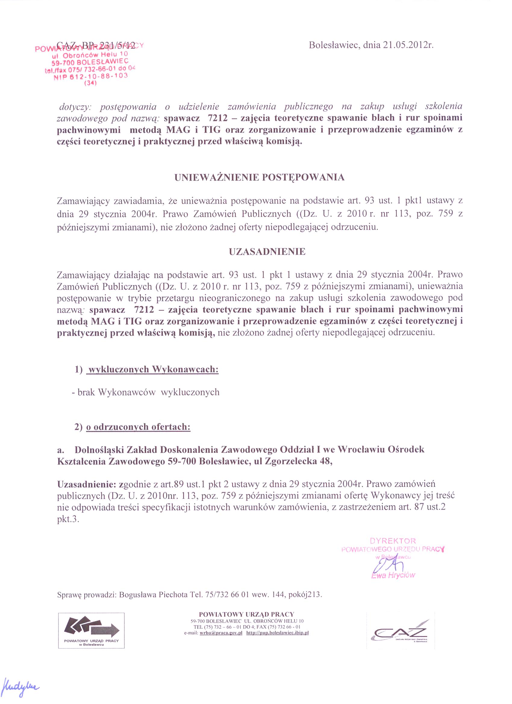 Rozstrzygnięcie - Przetarg nieograniczony na zakup usługi szkoleniowej - spawacz - CAZ-BP-213-7-12